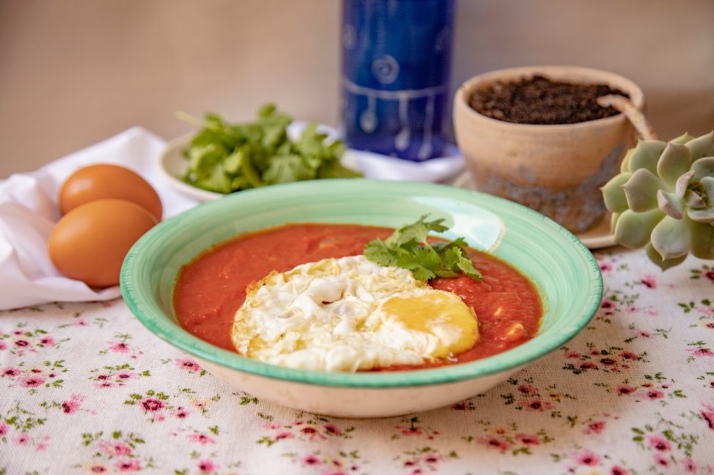 6.- A la hora de servir, ponemos en el fondo de un plato hondo este falso tomate frito, picamos sobre él cilantro fresco y ponemos un huevo frito, poché o incluso duro cortado en rodajas finas, como prefiramos.