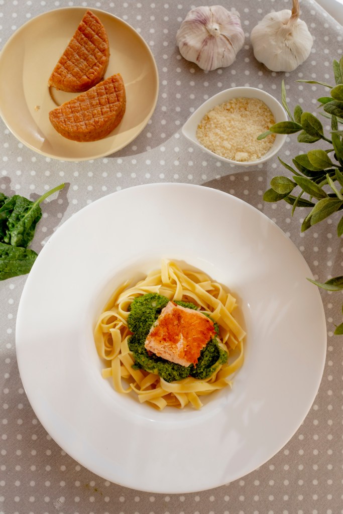 5.- Una vez cocidos los tagliatelle los repartimos directamente en los platos, repartimos sobre ellos el pesto de espinacas y añadimos el lomo de salmón.