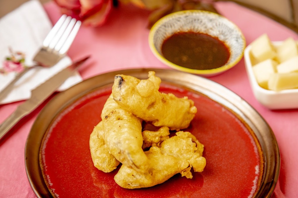 6.- Servimos los bastones de berenjena rebozados junto con un cuenco con la salsa de soja y miel para mojarlo en ésta.